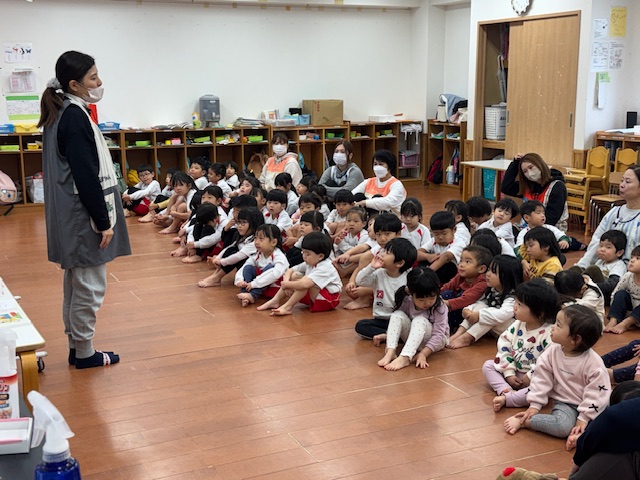 終業式では、お正月についての話を中心に、年末年始の過ごし方や行事の意味を、絵や言葉を交えながら伝えました。子どもたちは「おもち」「おとしだま」などの言葉に興味を示しながら、話を聞く姿が見られ、新しい年を迎えることへの期待を膨らませている様子でした。