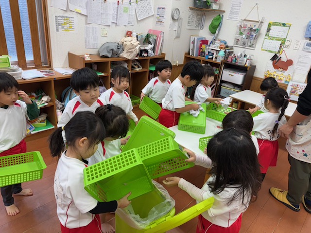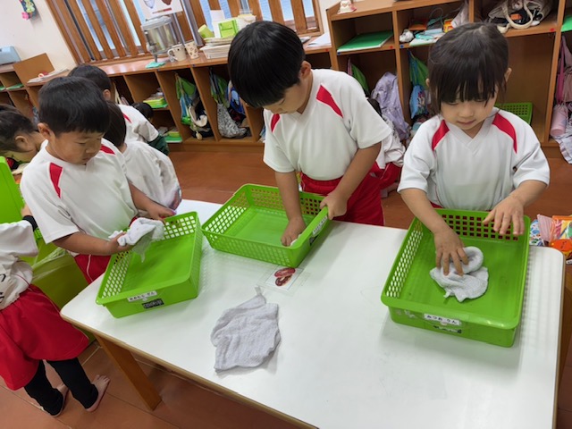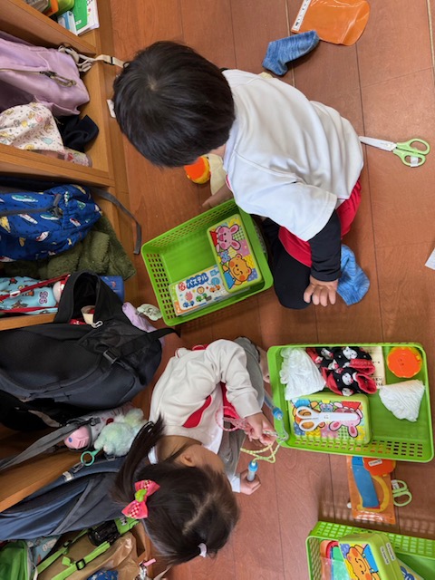 その後の大掃除では、ロッカーや道具箱、かごなどを一生懸命拭き、「ここもきれいにする!」と意欲的に取り組む姿が見られました。友だちと一緒に片付けたり、使った物を元の場所に戻そうとしたりする中で、身の回りを大切にしようとする気持ちが育ってきていることを感じました。