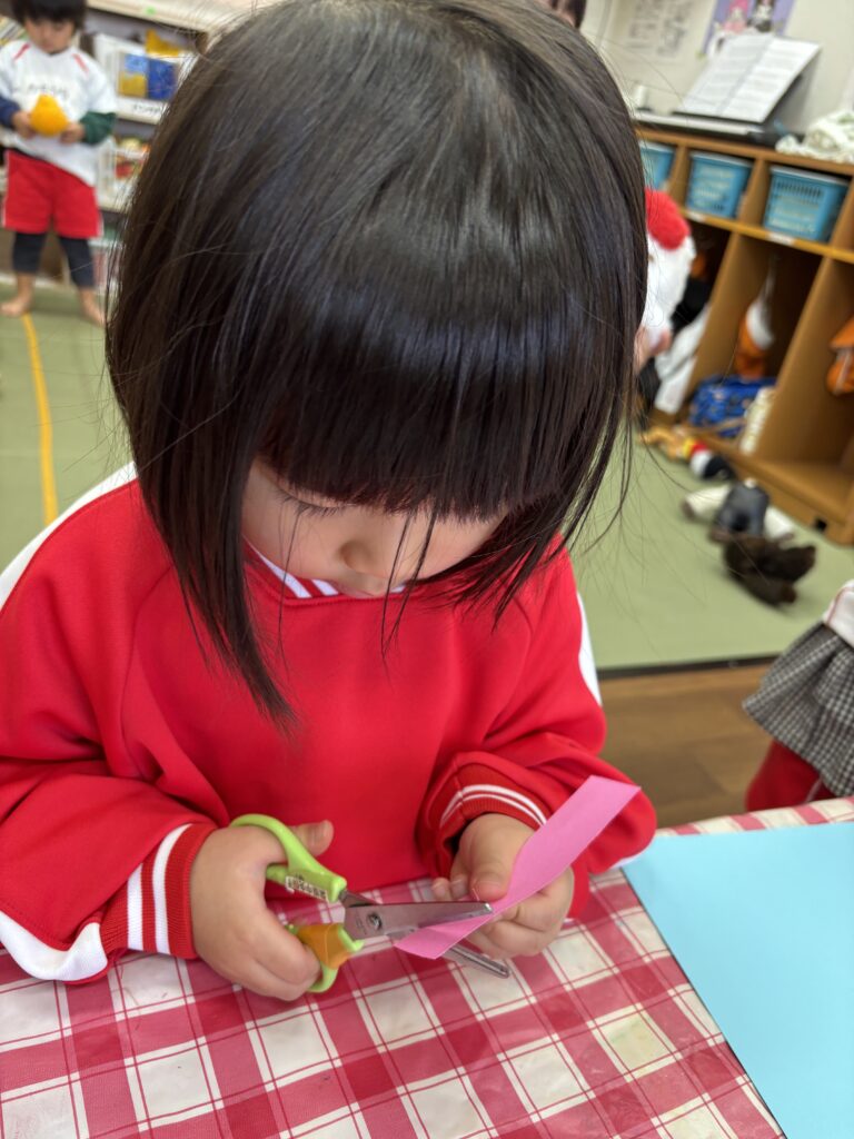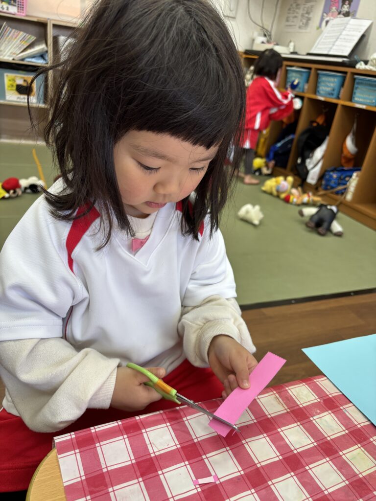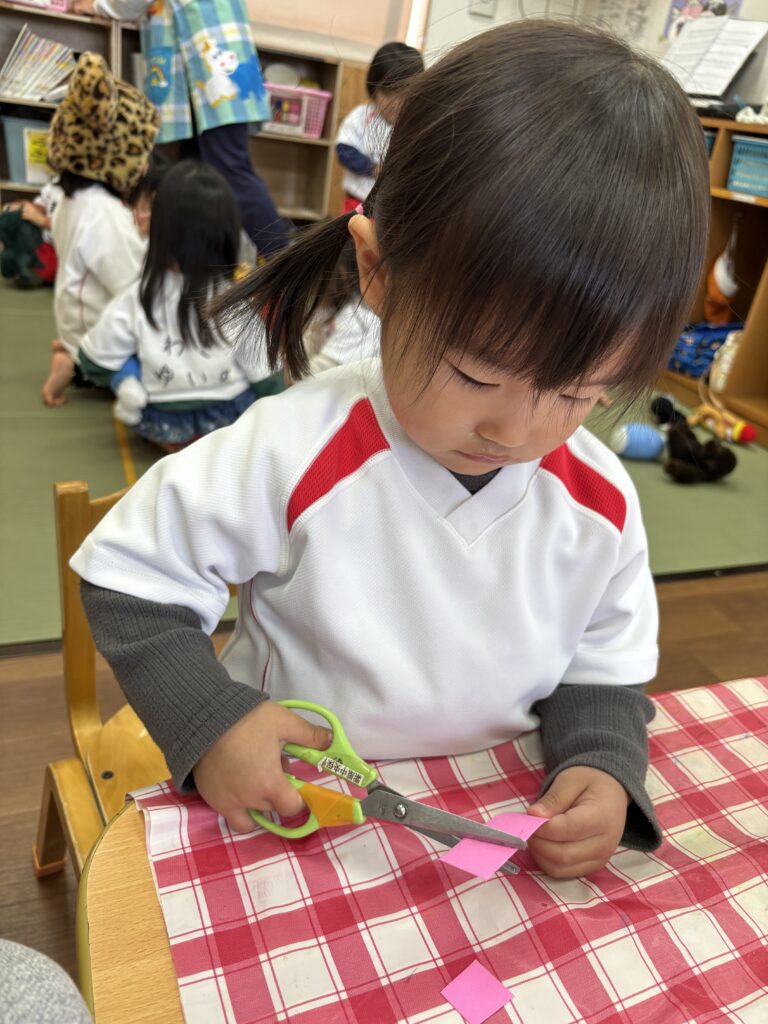 1月から、お箸やボタンかけ、ハサミの練習が始まっていて、少しづつ自分でできるようになってきたので、ハサミを使っ