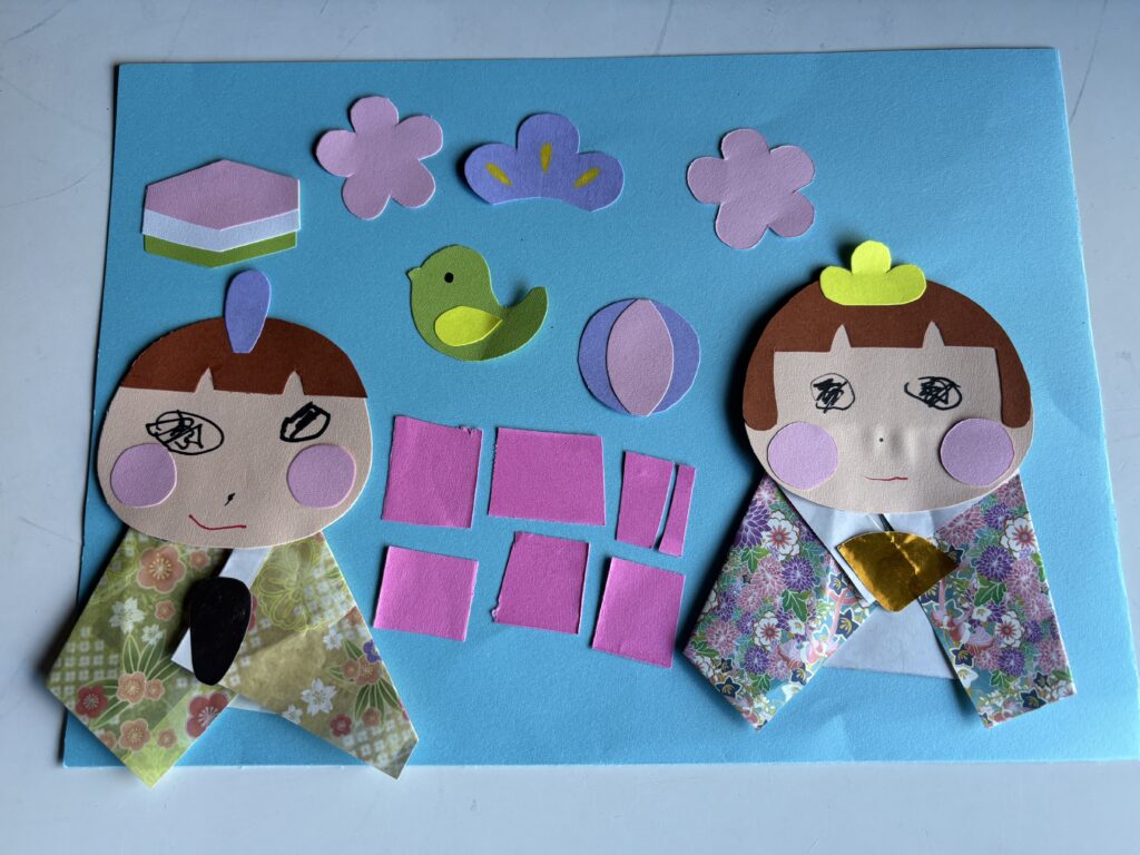 自分で顔を描いたり、台紙に貼ったりしました。